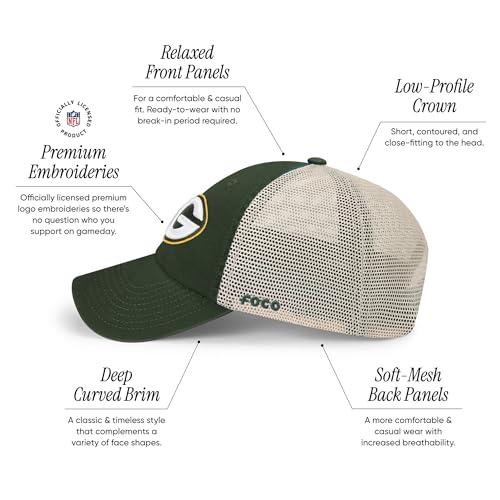 - ✔️RELAXED & COMFORTABLE FIT – Whether you’re looking for the perfect NFL baseball cap or a laid-back dad hat, the FOCO’s Casual Trucker hat is perfect for everyday use. The low, unstructured crown allows for a snug fit against your head. When not worn, the crown will lay down almost flat with the bill for easy storage day after day.
